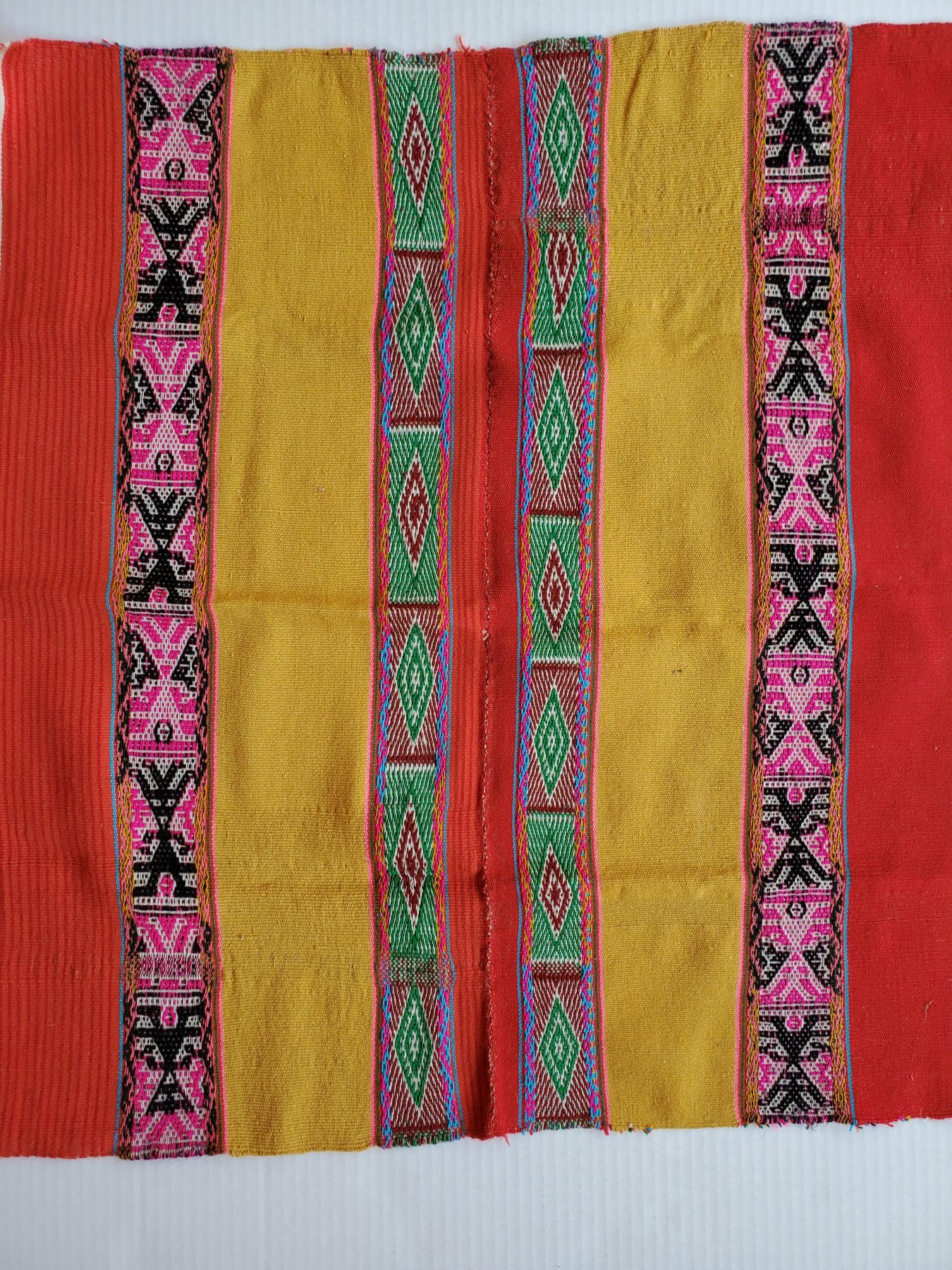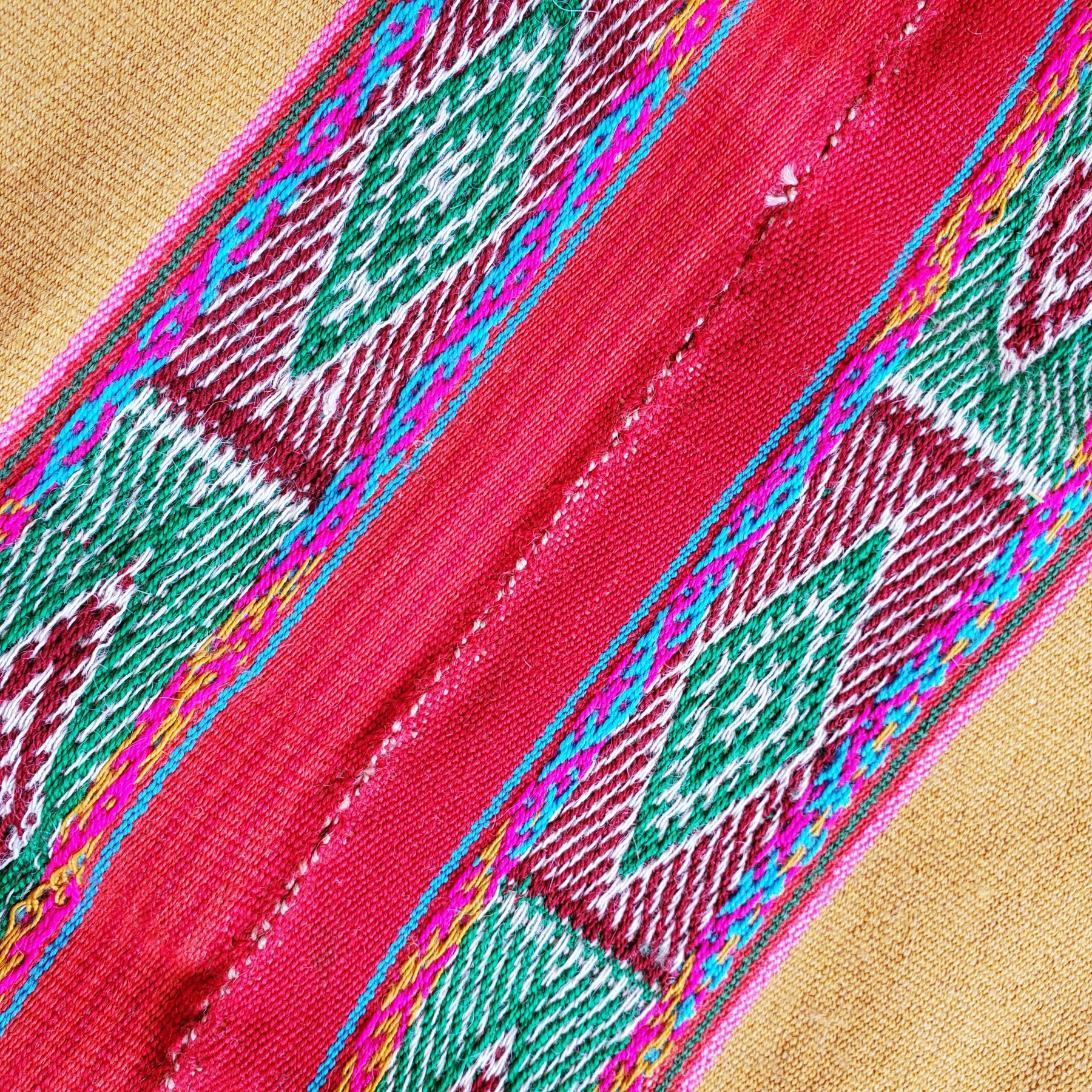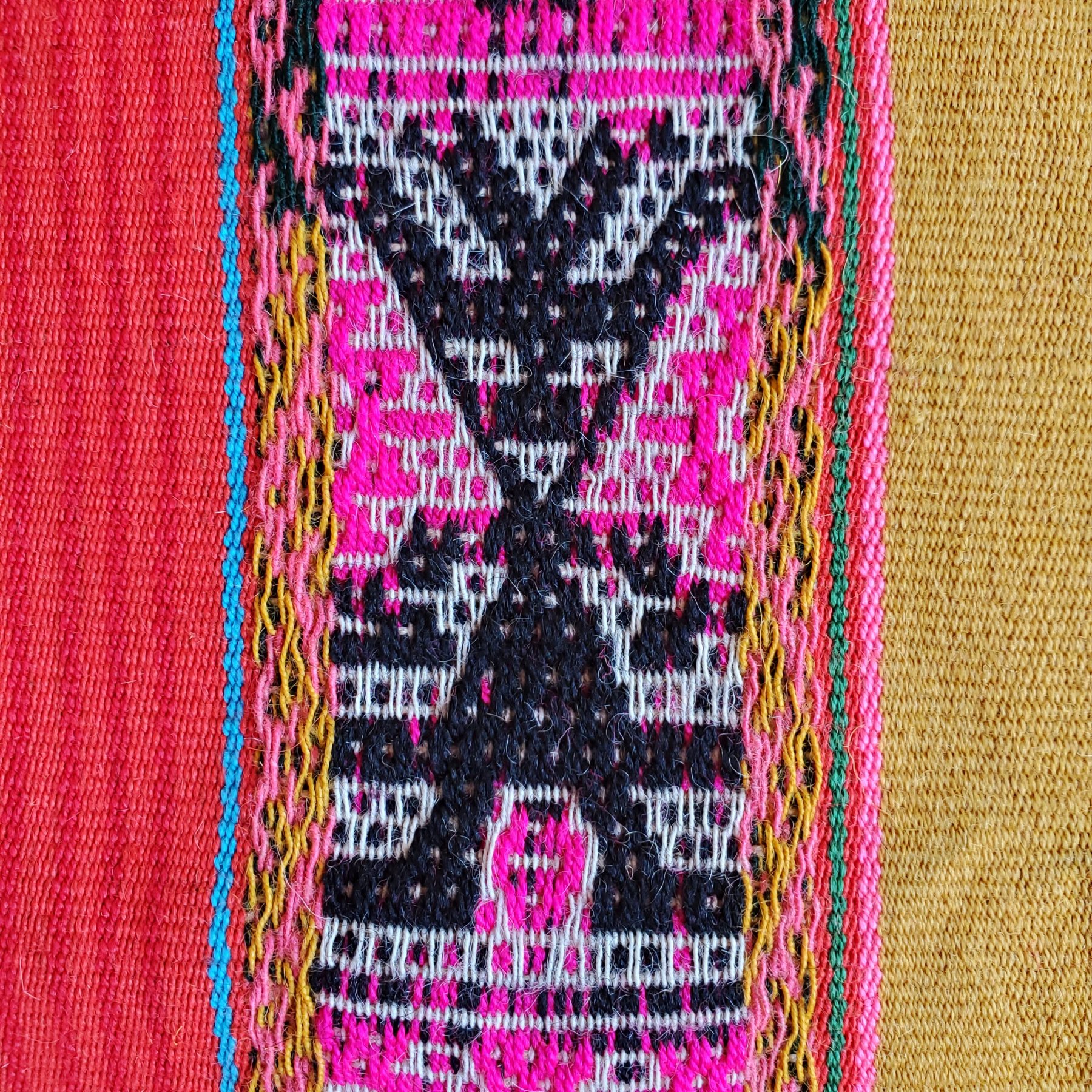 Q’ero weaver Silvia Phacsi Samata used bright colors to represent variations of the symbol of Inti (the Sun and Sacred Light) and the Chunchu figure, representing the coming return of the great Inka leader Inkarri. This cheerful mesa cloth features clear bright colors. It measures 28 x 26 inches (71 x 66 cm) and can fold easily. Your purchase helps Silvia, her family, and her village build food security and schools and helps preserve the beautiful Q’ero culture. Your purchase includes a photo of Silvia’s husband holding your new mesa cloth in their remote village of Kiku (Quico) Q’eros, at 12,000 feet in elevation.