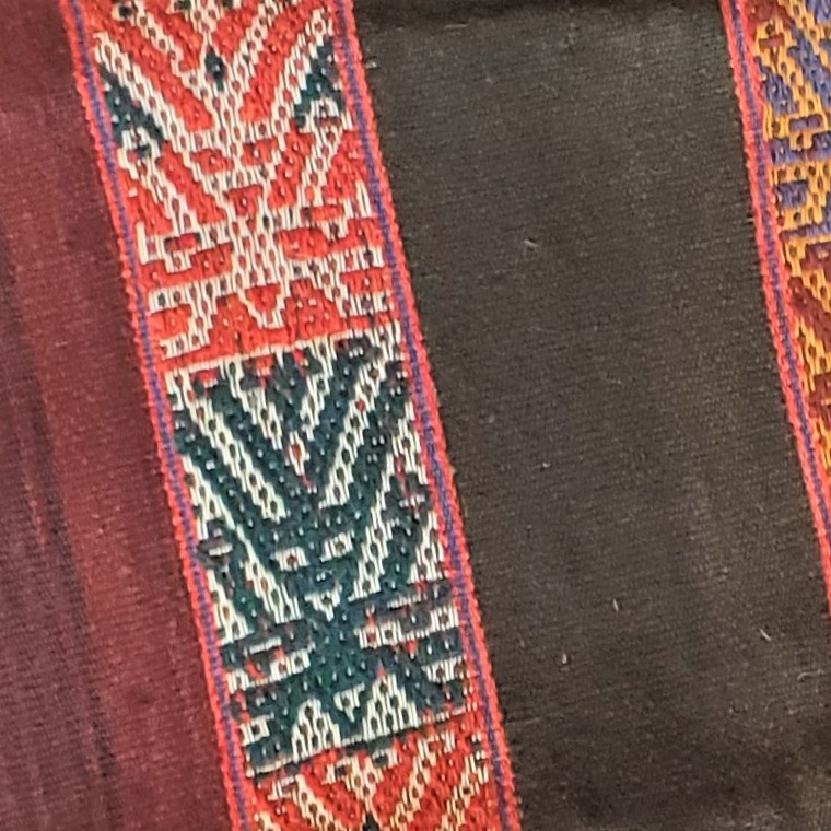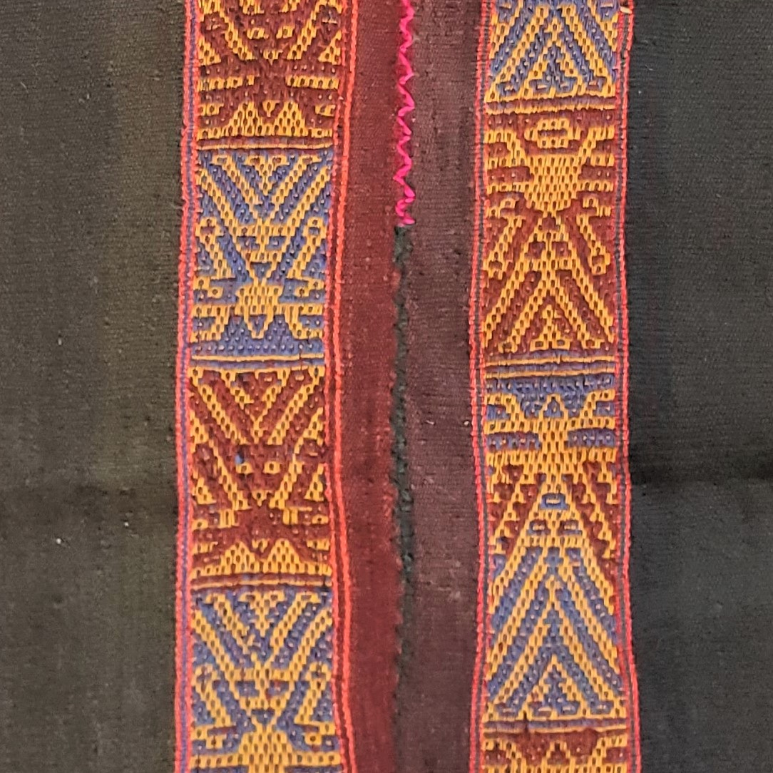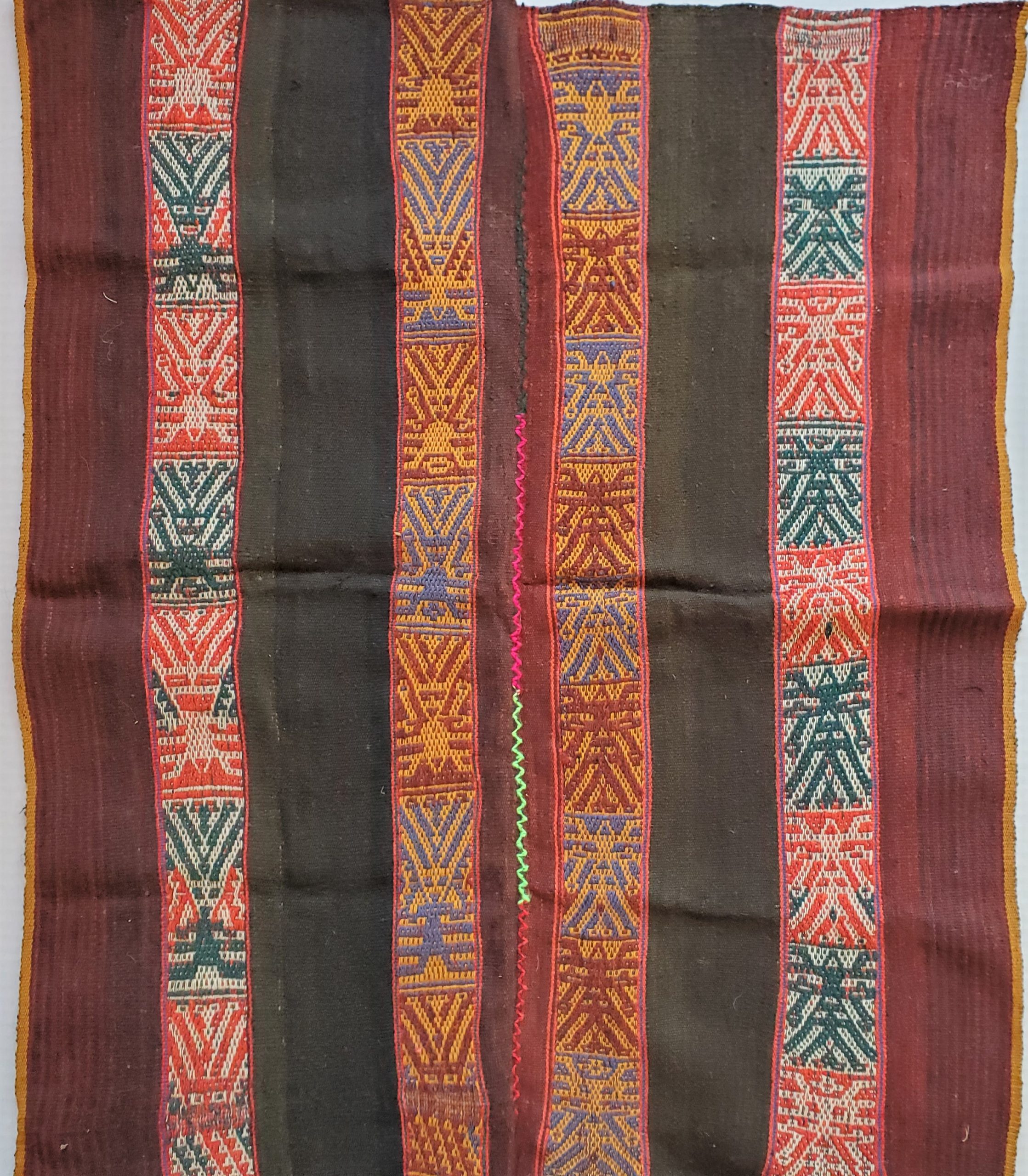 The 4 rows of images of Inkarri (Chunchu) in this mesa cloth evoke strength and confidence in a world coming into harmony and balance. The outer bands are woven in a subtle stripe of black within the red fields. This is an advanced skill and difficult to do well. The Inkarri expresses the Q’ero people’s belief in the coming return of Inkarri (great Inka leader) and the resurgence of the greatness of the descendants of the Inka people. Martina Phacsi Apaza used her skills to create this handsome woven textile framing the Inkarri with deep maroon and black fields. She knelt on the ground outside her home in Hapu Grande above 12,000 feet in elevation under the watchful protection of Apu Mama Rosa. Your purchase helps her children and her community build a more sustainable life and supports traditional Q’ero culture. 32 x 25 inches. 81 x65 cm.
