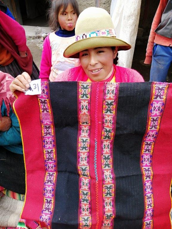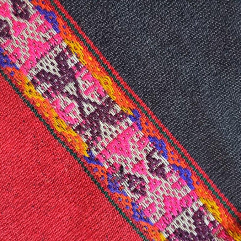 The complex images of Inkarri (Chunchu) in this mesa cloth evoke strength and confidence in a world coming into harmony and balance. The Inkarri symbols represents the Q’ero people’s belief in the coming return of Inkarri (great Inka leader) and the resurgence of the greatness of the descendants of the Inka people. Q’ero weaver Alicia Gerillo Qusipe, used her advanced skills to create this tightly woven textile framing the Inkarri with bright bold colors. Alicia wove this mesa cloth kneeling on the ground outside her home in Kiku Q’eros, at 12,000 feet in elevation under the watchful protection of Apu Mama Rosa. Your purchase helps her family and her community build a more sustainable life and supports traditional Q’ero culture. 29 x 25 inches. 74 x 64 cm. Your purchase includes a photo of Alicia holding your new mesa cloth.