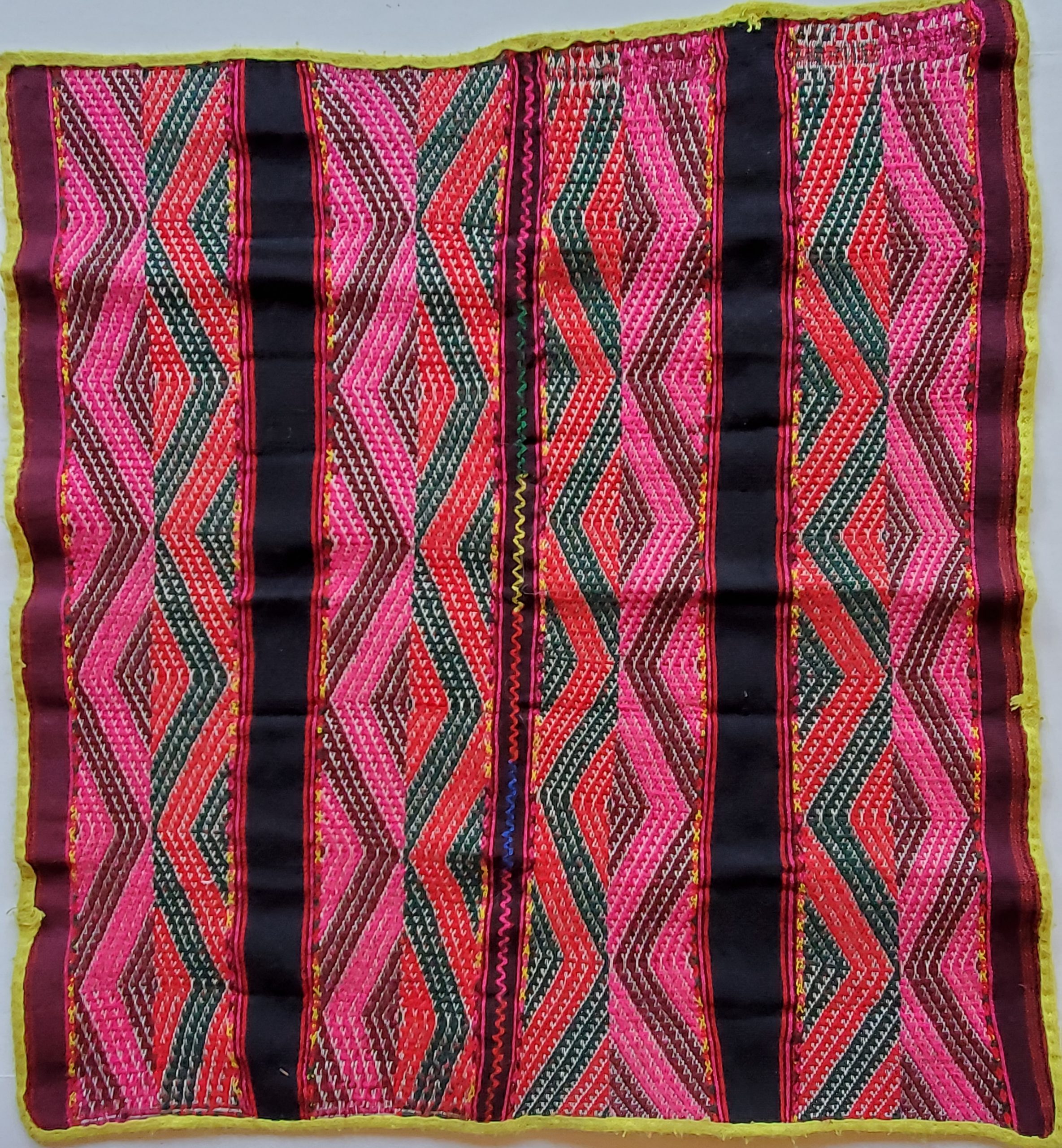 This traditional mestana was woven in the classic style with distinctive Inti symbols of sacred light and sun in split diamond shapes. The woven patterns of sunrise, sunset, and the sun at midday — as well as the bordering bands of growing fields — reflect Q’ero life as strongly connected to the sacred earth of Pachamama, the Apus, and all beings. Elder Ricardina Apaza Gerillo knelt on the ground outside her home in Yanruma, leaning over her loom for many days to produce this finely balanced classic textile. 25 x 25.5 inches. 60 x 60.5 cm. Your purchase helps Ricardina, her family, and her community build schools and food security.