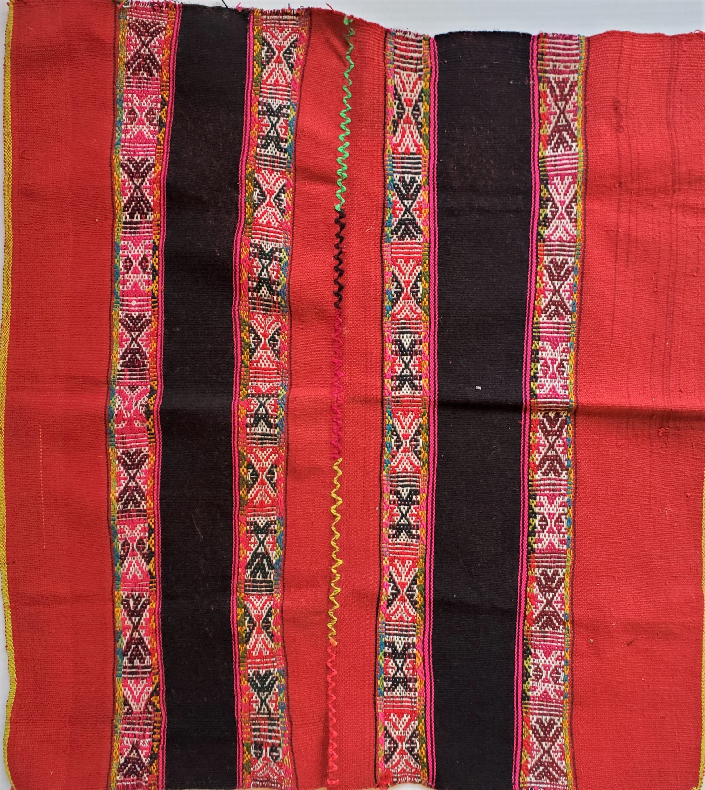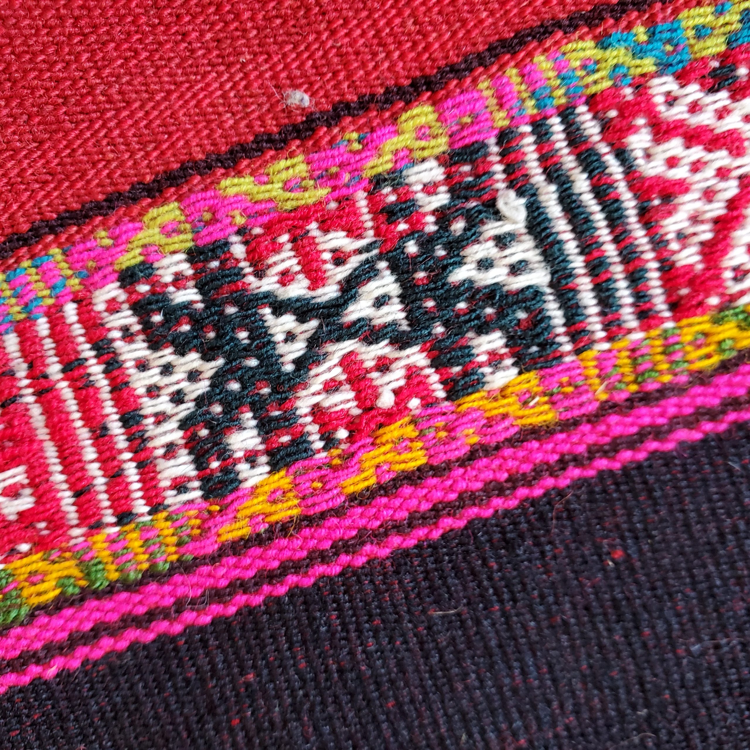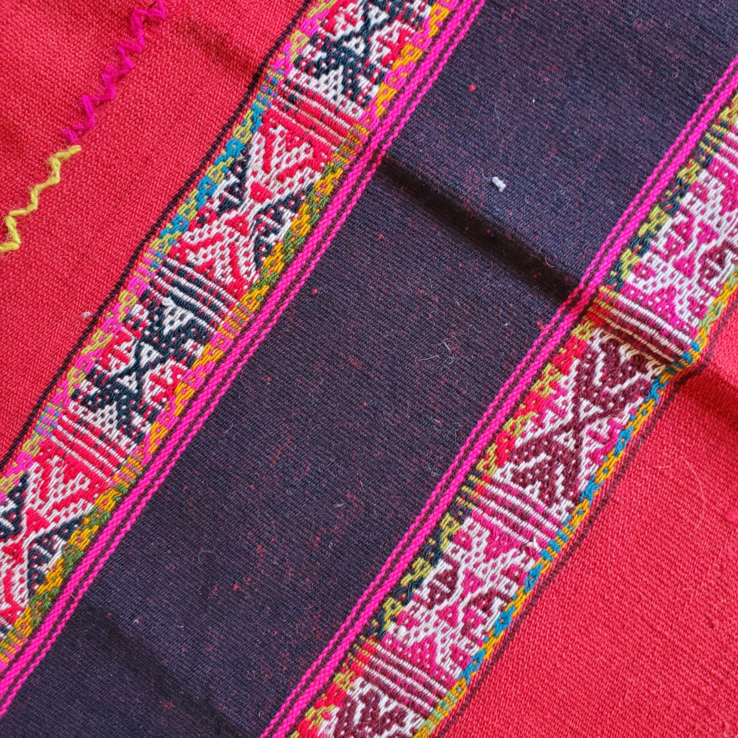 This traditional mesa cloth was woven in the classic style with symbols of the Chunchu, or Inkarri. The Andean myth of the Inkarri predicts that the great Inka will return to restore the Andean people to their former glory. The complex woven patterns reflect Q’ero life as strongly connected to the agricultural fields of Pachamama, the Apus, and all beings. Q’ero weaver Maria Machacca Apaza created this textile outside her home under the watchful gaze of Apu Mama Rosa. She knelt on the ground leaning over her loom for many days to produce this finely balanced textile. 26 x 25 inches. 66 x 62 cm. Your purchase includes a photo of the waever’s husband holding your new mestana. NOTE: the red bands are a softer, deeper red than appears in the photo.