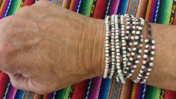 Q’ero watana beaded strands (senq’apas) are used to tie mesa bundles. Q’ero women also use them as hat straps that fall below the chin. Many westerners use these strands of beads as bracelets, necklaces or home decor. Choose from four lengths.